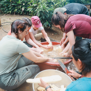 L’heure est venue de participer aux fameuses «Mingas», les séances de travail collectif et solidaire, essentielles à la vie communautaire des Sarayaku. Le matin, vous participez activement aux tâches partagées par les habitants : entretien des sentiers, réparation de structures, ou aménagement des jardins communautaires. Les après-midis sont dédiés à l’exploration de la communauté et de ses installations, telles que l’école et le centre de santé, véritables symboles de l’autonomie des Sarayaku. Vous partez également en randonnée en forêt, guidé·e·s par des membres de la communauté, pour observer de plus près la faune et la flore locales, et comprendre l’importance de cet écosystème pour leur mode de vie. Pendant votre séjour, vous vous initiez aussi aux techniques de pêche traditionnelle et à l’utilisation de la sarbacane, un savoir-faire ancestral. Ces activités immersives vous permettent de mieux appréhender la relation profonde entre les Sarayaku et leur environnement, ainsi que leur lutte pour préserver cette nature précieuse.